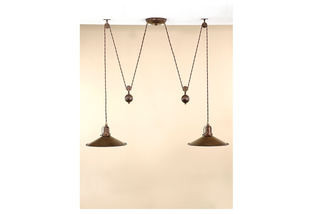 Design & Materials: Crafted from solid brass, this pendant features two cone-shaped metal shades suspended by twisted cords and an authentic pulley system. The antique finish and industrial silhouette evoke the charm of early 20th-century workshop lighting.