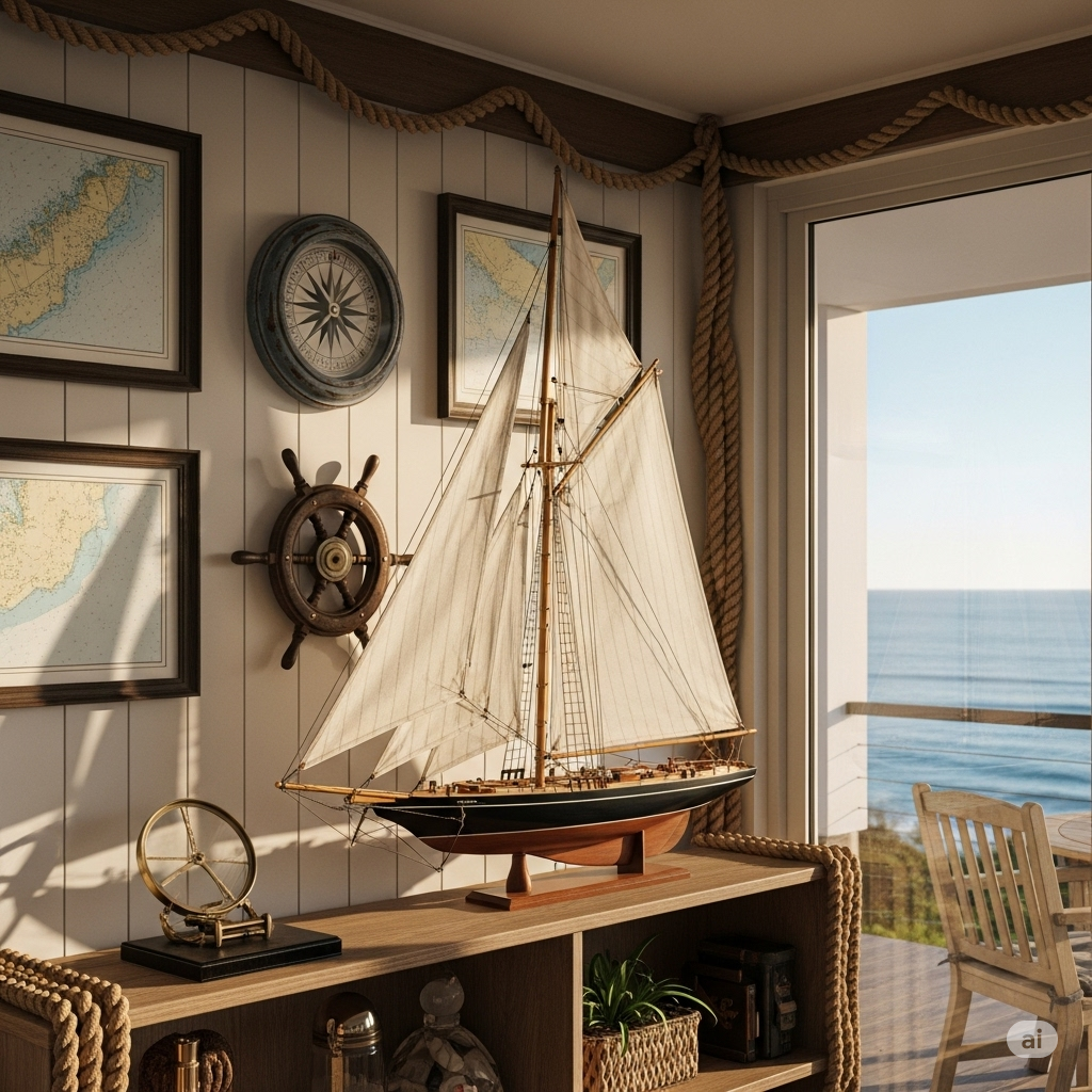 To achieve a cohesive coastal living decor theme, blend ship models with other ocean-inspired elements: