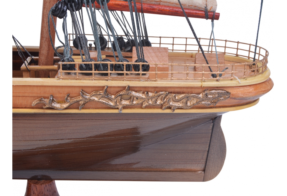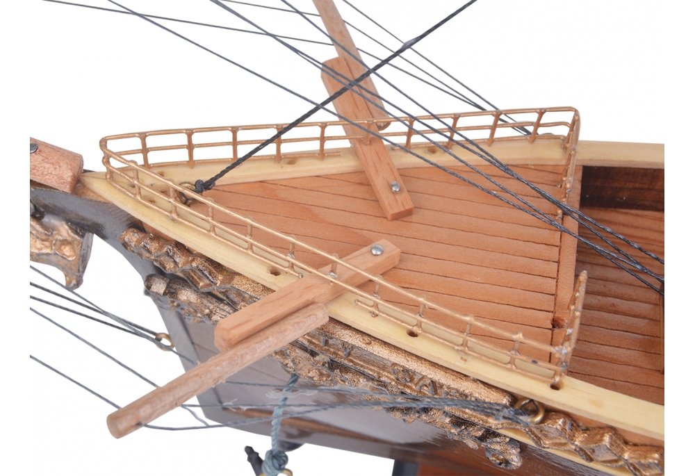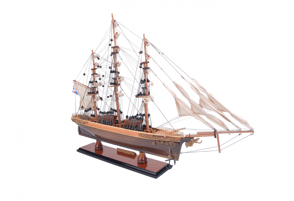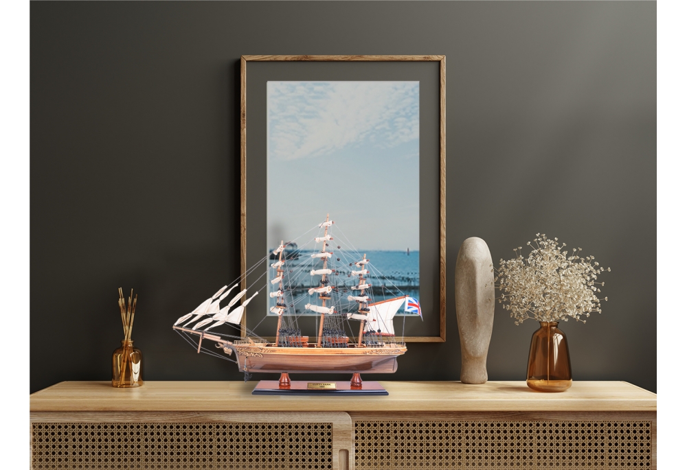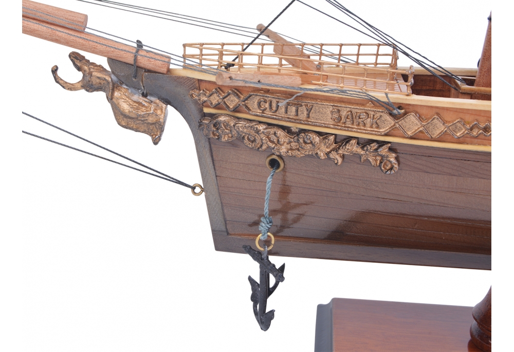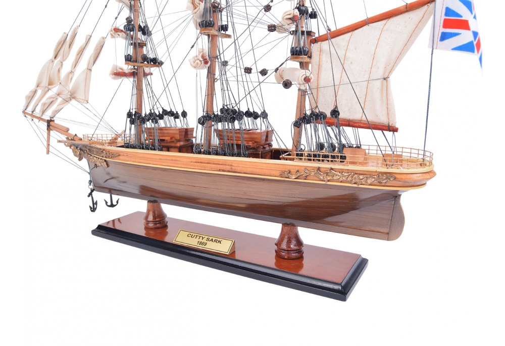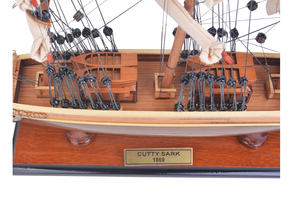 Our Cutty Sark model is scratched built plank on frame and strip by strip of exotic wood put together. It is completely hand built by skillful and creative master craftsmen; you will be amazed at how real it looks. The hull is truly beautiful, combined with skills and pure wood, the hull is smoothening out equally giving a shiny and silky feel on side of the hull. On the ship, you can easily locate stunning wooden details such as: 3 wooden booms, 1 wooden bunker, 4 front and 1 main masts with fabric sails and detailed stitching, all rigging are matching colors, 4 wooden boats, 2 wooden storage room, 2 metal fences on the front and back of the ship, 2 metal ornaments embedded with Cutty Sark locating in the back and front left of the ship, 2 metal anchors, 1 metal statue in front of the ship, and many more. We absolutely use no plastic parts only the highest quality wood and metal. Our model was built according to scale through original plans, pictures and drawings. Attached to this model is a wooden stand with a metal name plate embedded "Cutty Sark 1869". This model is being ship inside a secure wooden crate; it comes fully-assembled and ready to be display.