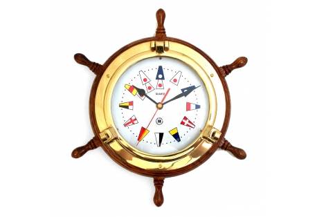 Brass Porthole Clock on Oak Ship's Wheel w/Nautical Signal Flags